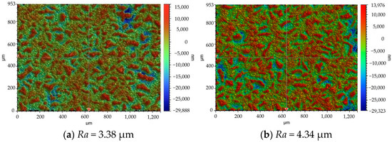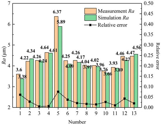 Figure 15 shows the comparative analysis between the simulated and experimental results of Ra. From Figure 15, the simulation values of Ra show good agreement with the experimental result, with a relative error of 0.47 to 7.54%. This indicates that the established thermophysical model during the MPDP has high accuracy, which can provide some guidance value for practical production, such as in the setting of discharge parameters.