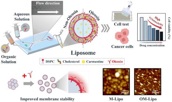 The following supporting information can be downloaded at: https://www.mdpi.com/article/10.3390/ma17225550/s1, Figure S1: Fabricated microfluidic device and design; Figure S2: Carbon Film Heater with Temperature Controller for DSPC Phase Transition; Figure S3: Instability analysis of carmustine in aqueous phase using RP-HPLC; Figure S4: SDS-PAGE gel image for showing the different concentration of Rapeseed oleosin extracted by MHE methods; Figure S5: Aggregation of DPSC inside a microfluidic channel; Figure S6: Atomic force microscope-based 3D image surface analysis of M-lipo and OM-lipo; Table S1: Information on materials used for SDS-PAGE analysis.