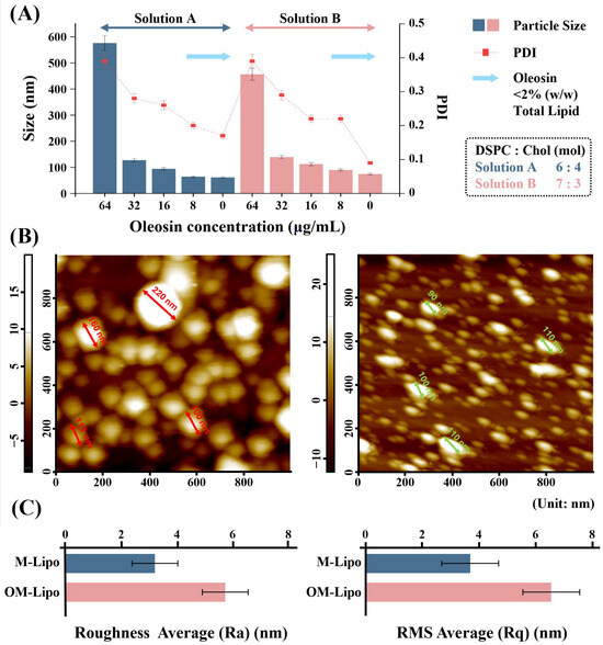 Figure 2. Particle characterization of fabricated microfluidic-derived liposomes. (A) Dynamic light scattering-based particle size and polydispersity index (PDI) analysis of OM-Lipo synthesized with varying oleosin concentrations (64, 32, 16, 8, and 0 µg/mL) and lipid formulations (DSPC ratios of 6:4 and 7:3). Bars represent particle size and squares indicate polydispersity index (PDI). OM-Lipo with a 6:4 ratio produced smaller particles compared to the 7:3 ratio. Oleosin concentrations below 2% (w/w) of the total lipid resulted in similar particle size and PDI to M-Lipo. (B) Atomic force microscopy-based liposome surface imaging analysis and (C) roughness measurements for M-Lipo and OM-Lipo.
