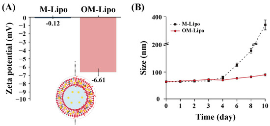 Figure 3. Particle stability test for M-Lipo and OM-Lipo in refrigerated storage (4 °C). (A) Initial zeta potential and (B) particle size measurement for 10 days.