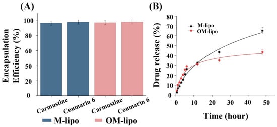 Figure 4. Evaluation of drug encapsulation efficiency and release profile of the fabricated carrier. (A) Drug encapsulation efficiency of carmustine and coumarin-6 in M-Lipo and OM-Lipo. (B) Coumarin-6-based cumulative drug release profile data.