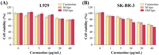 Figure 5. Cell viability of (A) normal cells (L929) and (B) cancer cells (SK-BR-3) according to treatment with carmustine (free drug), or the same drug concentration loaded onto M-Lipo and OM-Lipo.