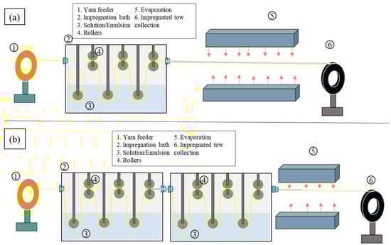 Impregnation process with (a) a single impregnation bath and (b) two baths in tandem.