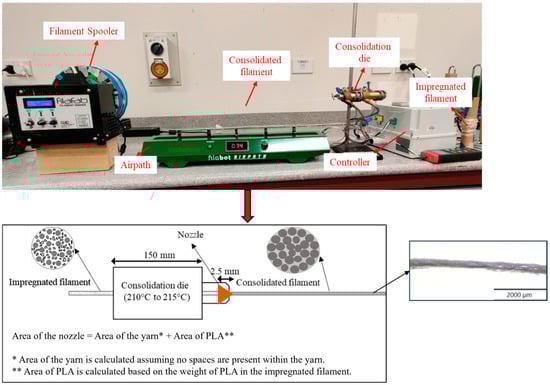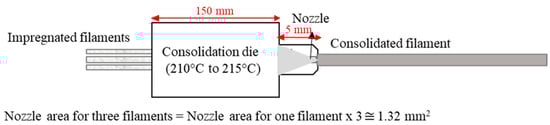 To improve matrix-to-fibre bonding and eliminate voids, the impregnated yarns underwent a consolidation process. The impregnated filament was dried in a vacuum oven at 80 °C for six hours, then passed through a heated consolidation die. Figure 3 provides the die dimensions and the calculation for the exit nozzle area. The die’s entrance and exit were tapered to prevent void formation, with the die temperature maintained between 210 °C and 215 °C.