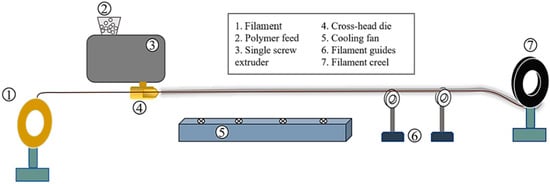 The consolidated filament, created by combining three filaments into one, had a high fibre content (60% to 70%), which caused nozzle clogging and print failures. To address this, an additional melt impregnation step was added to optimise both the filament diameter and fibre content. Figure 5 shows the production setup where the combined filament is fed into a crosshead die attached to a Filabot single-screw extruder (Barre, VT, USA). The crosshead die was maintained at 190 °C, allowing molten PLA to be injected continuously, impregnating the filament with polymer. The filament then passes through a cooler (Filabot Airpath, Barre, VT, USA), where it is cooled before being wound onto a creel using a spooling system. Extrusion and spooling speeds were carefully controlled to maintain a consistent filament diameter of 1.45 ± 0.5 mm.