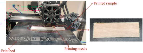 A MakerGear® M2 desktop printer was used to produce samples for tensile (Beachwood, OH, USA), flexure, and impact testing. Samples were cut from 3D-printed rectangular shapes to meet the required dimensions for mechanical testing. Figure 6 shows the 3D printing process in progress. All samples were printed with 100% infill density, using a 1.5 mm nozzle, a raster angle of 0°, and a layer height of 0.8 mm. The bed temperature was set at 60 °C, the nozzle temperature at 190 °C, and the printing speed at 300 mm/min. Upon completion of printing, the filament was manually cut to prevent any movement or displacement of the printed sample. Control samples of pure PLA were printed with the same settings to allow for a consistent comparison with the composite samples.