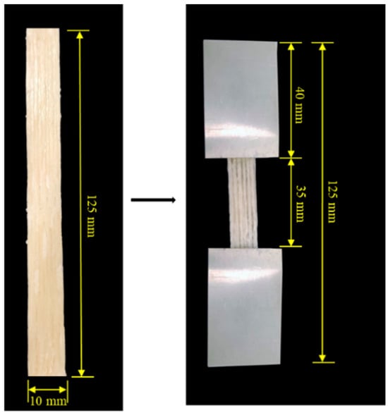 The 3D-printed specimens were tested along the fibre direction with end tabs in accordance with ISO 527-5 standard [18]. Tensile testing was conducted on an Instron® 5982 tensile tester equipped with a 5 kN load cell. Aluminium end tabs were attached to the specimens using Araldite epoxy, as shown in Figure 7. Testing was performed with a crosshead displacement rate of 5 mm/min, and tensile strain was measured using a 10 mm clip-on extensometer. Five specimens were tested for each composite type.