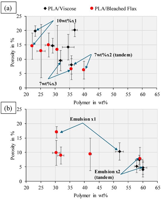 Porosity vs. polymer wt% for different viscose and bleached flax-based single yarn-reinforced filaments produced by (a) solution impregnation; (b) emulsion impregnation. The formulations with the lowest and highest porosity percentages are indicated using the blue arrows.