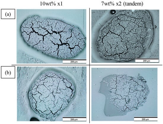 Optical microscopy images of cross sections of solution-impregnated filaments for 10 wt% (left) and 7 wt% x2 (tandem) (right) formulations with (a) PLA/viscose; (b) PLA/ bleached flax.