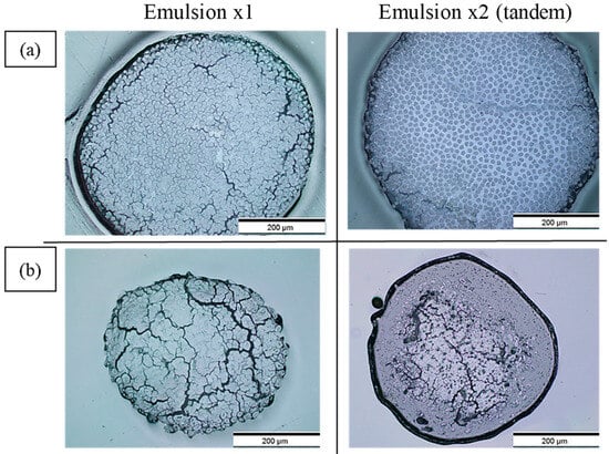 Optical microscopy images of cross sections of emulsion-impregnated filaments for Emulsion x1 (left) and Emulsion x2 (tandem) (right) formulations with (a) PLA/viscose; (b) PLA/bleached flax.