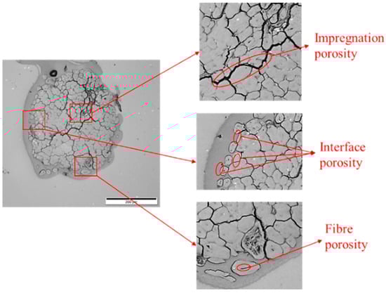 Types of porosities observed in optical microscope images of consolidated filaments.