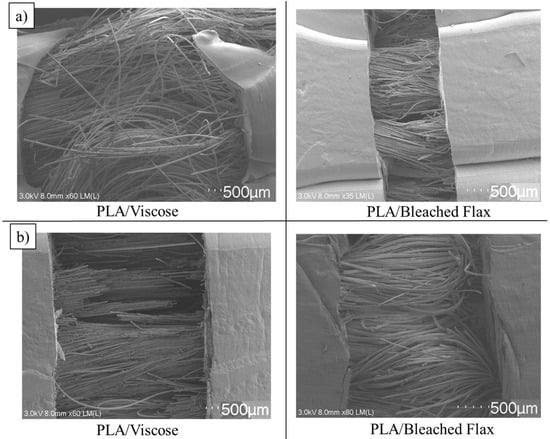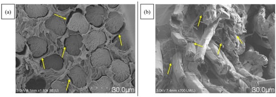 SEM images of cryofracture surfaces depicting mechanical interlocking between PLA and fibres—(a) PLA/viscose and (b) PLA/bleached flax (scale bar = 30 µm). The yellow arrows indicate the gaps between fibre and matrix after cryofracture.