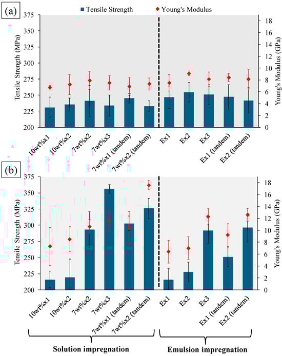 The tensile properties of single yarn composite filaments produced from solution and emulsion impregnation processes are shown in Figure 13. The complete tensile test data, along with the strain at break percentages, are given in Tables S5 and S6 of the Supplementary File. For PLA/viscose composites, an optimum polymer content of 58.8 wt% for the Emulsion x2 formulation resulted in the highest tensile strength of 254.7 ± 15.3 MPa and a Young’s modulus of 9.1 ± 0.4 GPa. In the case of PLA/bleached flax composites, formulations with lower porosity resulted in higher tensile properties. The 7 wt% x3 solution impregnation formulation with PLA/bleached flax exhibited the highest tensile strength (356.1 ± 6.8 MPa), while the 7 wt% x2 (tandem) had the highest Young’s modulus (17.6 ± 0.8 GPa).