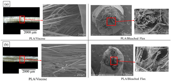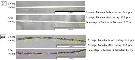 Notably, the strain at break for PLA/viscose filaments was significantly higher than that of individual viscose fibres (εb of 10.7–15.6% for the composites compared to a εb of 13.2% for single fibres). This difference may be attributed to fibre sliding within the filament, caused by reduced fibre diameter during tensile testing. Viscose fibres generally exhibit a greater reduction in diameter than flax fibres under tensile stress, which can lead to fibre separation and sliding, resulting in increased strain at break values. Figure 14 illustrates the diameter differences for individual viscose and bleached flax fibres before and after tensile testing, highlighting the reduction observed in viscose fibres.