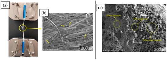 (a) Macroscopic failure of tensile-tested solution-impregnated PLA/viscose composite filaments; (b) SEM images of fracture surface of solution-impregnated PLA/viscose composite filament; (c) SEM image of fracture surface of emulsion-impregnated PLA/viscose composite filaments (scale bar = 200 µm) (Yellow arrows in (b) indicate the areas of polymer debonding).