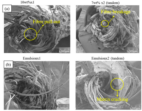 The failure surfaces of the PLA/bleached flax composites are shown in Figure 16a for the solution impregnation method and Figure 16b for the emulsion impregnation method. Both impregnation techniques exhibited similar fracture behaviours, characterised by significant fibre pull-out due to debonding between the fibre and matrix [35,36]. In high-performing flax fibre-reinforced composites, fewer fibre pull-outs and more fibre breakage were observed, indicating stronger interfacial bonding between the fibres and the matrix [37]. Emulsion-impregnated flax filaments also showed matrix cracking, alongside fibre pull-outs and debonding, as highlighted in Figure 16. Matrix cracking is often associated with the presence of voids or inclusions within the matrix [38].