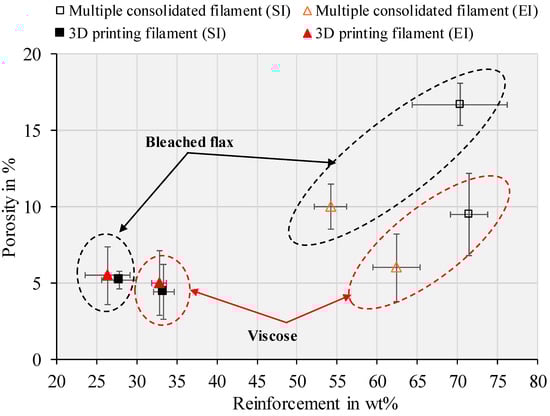Porosity % vs. reinforcement wt% of viscose and bleached flax-based multiple consolidated and 3D printing filaments (SI—solution impregnation; EI—emulsion impregnation).