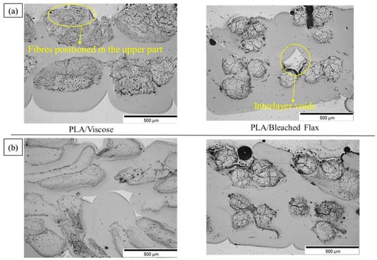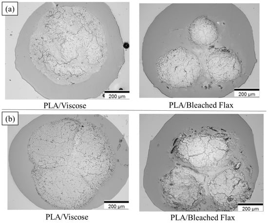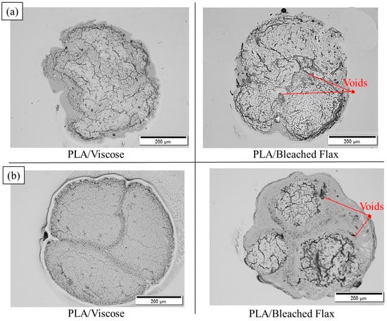 Figure 9 and Figure 10 show the cross-sectional views of the filaments obtained via optical microscopy, with images for all formulations provided in the Supplementary File (Figures S14–S17). These images reveal voids with a crack-like structure, along with other smaller voids. As illustrated in Figure 11, the voids are categorised into impregnation, interface, and fibre porosity types [23]. Impregnation porosity, observed as crack-like voids, is present in all filaments, suggesting incomplete polymer impregnation. Interface porosity, due to weak interfacial adhesion, is more pronounced in PLA/viscose filaments, likely because of the smooth surface of viscose fibres (refer to Figure S5). Fibre porosity, originating from the lumen in bio-derived fibres, is only found in filaments reinforced with bleached flax.