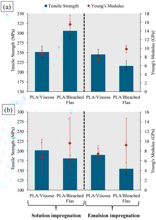 Tensile strength and Young’s modulus of single yarn-reinforced filaments: (a) PLA/viscose, (b) PLA/bleached flax.