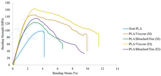Solution-impregnated PLA/viscose composites demonstrated exceptional impact strength, showing a 502% increase compared to neat PLA. Similarly, solution- and emulsion-impregnated PLA/bleached flax composites displayed comparable impact strengths, with increases of 214% and 221.5%, respectively, over neat PLA. Notably, the impact strength of emulsion-impregnated PLA/viscose samples exceeded the upper limit of the Charpy impact testing machine and thus is reported as >127 kJ/m2 in Table 7. Based on the findings of this study, the Charpy impact strengths obtained here surpass any reported values for bio-derived fibre-reinforced PLA composites to date [63,64,65,66,67,68,69].
