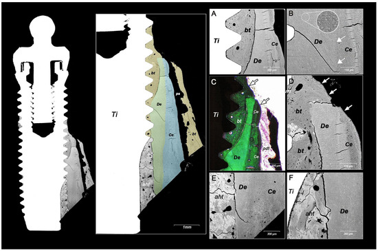 Dental tissue in contact with a dental implant in a human sample obtained after implant extraction due to peri-implant disease. The two images on the left display the complete sample, with dental tissue and bone in contact with the implant surface (Ti). Bone tissue (bt) is highlighted in yellow, dentin (De) in green, and cementum (Ce) in light blue. The periodontal space (ps) is visible near the dental tissue (cementum). The lower portion of the image shows an amorphous hard tissue (aht) containing bone tissue fragments, apparently integrated with newly formed cementum between the dentin and implant surface. Images (A–F) present histological details from the sample. In (A), bone tissue is observed between the implant threads and dental tissue (dentin and cementum). In (B), perforations on the surface indicate dentinal tubules (enhanced in the white circle with increased contrast); additionally, the boundary between dentin and cementum is marked (white arrows). In (C), trichrome staining reveals non-calcified periodontal tissue (pdt) compatible with the periodontal ligament, along with other hard tissues (cementum, dentin, and bone). In (C,D), cementum is observed over dentin and bone tissue (white arrows).