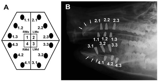(A): Schematic illustration of implant distribution. Black circles indicate implant positions. RMx: Right maxilla; LMx: left maxilla; RMd: right mandible; LMd: left mandible. (B): Postoperative lateral radiograph showing implant distribution. White arrows indicate the position of the canines.