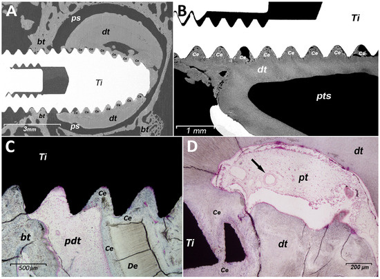 Postoperative radiographs revealed that the implants placed anteriorly were situated near the canine teeth (implants 1.1, 2.1, 3.1, and 4.1 in Figure 2), which have long roots extending antero-posteriorly within both the maxillary and mandibular bones. Subsequently, during the sectioning process of samples embedded in plastic, implants 1.1 and 4.1 from specimen 1 were found to be in contact with dental tissues. Despite this, the animals exhibited normal behavior and feeding patterns, without any signs of discomfort during the observation period. Histological analysis revealed that implant 4.1 had penetrated the surface of the mandibular canine, while the right maxillary canine was superficially contacted by implant 1.1. In histological images obtained via BS-SEM (Figure 3A,B), tooth tissue formation was evident between the implant threads. Examinations of implant 4.1 and the surrounding tissue showed that bone, periodontal ligament, and tooth tissue (cementum) had adapted to the implant’s surface (Figure 3C). In both implants, new cementum and bone were observed on their surfaces, originating from the adjacent tissue, indicating the simultaneous integration of the implant by both bone and tooth tissue. Furthermore, histological analyses of the mandibular canine revealed pulp tissue exhibiting characteristics of vitality (Figure 3D).