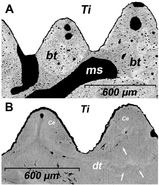 (A): BS-SEM image of threads from the osseointegrated dental implant 4.3 (specimen 1). (B): BS-SEM image illustrating dental tissue (dt) in contact with the implant’s surface (implant 4.1), consistent with acellular cementum, demonstrating the cementointegration of the implant. Dentin is identified via the presence of dentinal tubules (white arrows). Cementum (Ce) is observed forming between the dentin and the implant surface. bt: Bone tissue; ms: marrow space; Ti: titanium dental implants.