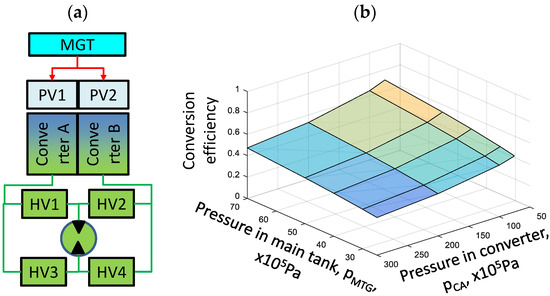 Pneumatic–hydraulic system (a) configuration; (b) conversion efficiency. MGT—main gas tank; PV—pneumatic valve; HV—hydraulic valve.