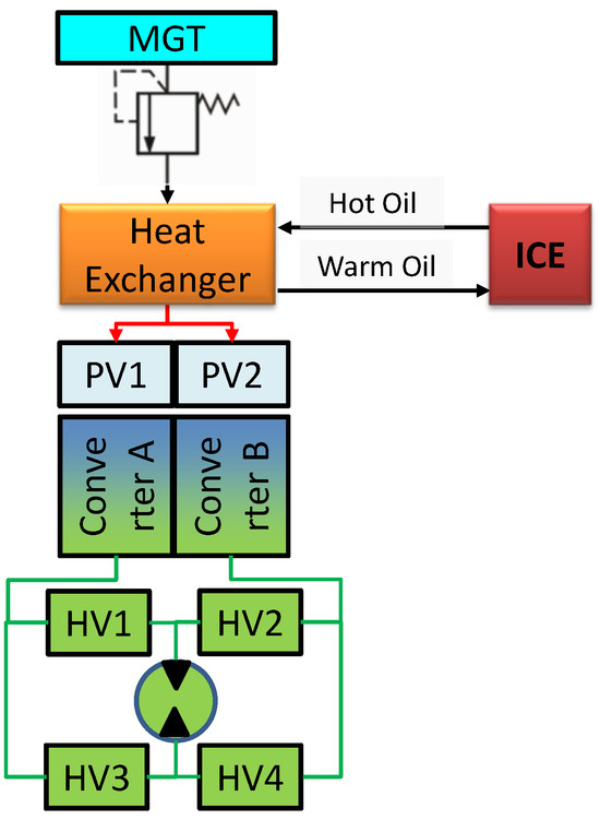 Pneumatic–hydraulic unit with a heat exchanger. ICE—internal combustion engine; MGT—main gas tank; PV—pneumatic valve; HV—hydraulic valve.