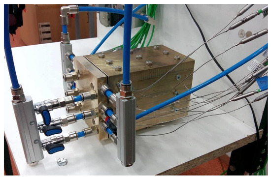 Taking into account the requirements specified at the beginning of Heat Exchanger, it was decided that the heat exchanger would take the form of a brass block in which winding channels placed on several horizontal planes were made. The channels are designed for the flow of air and oil. The compact design with a relatively thick wall should ensure the high strength of the exchanger and store a significant amount of heat, which can be important in the exchanger’s intermittent operation mode (typical of a hybrid drivetrain). The use of brass ensures the lowest possible resistance to heat conduction through the wall between the air and oil channels. The exchanger block is composed of symmetrical, repetitive flat plates (Figure 3a). On the lower and upper surfaces of each plate are milled channels with semicircular cross-sections (when the plates were assembled, channels of circular cross-sections were formed). The pair of adjacent air and oil channels and the plates forming them constitute a single module with a specific thermal power. By changing the number of plates, you can obtain a heat exchanger with any number of such modules. If the total heat output of the exchanger is not required, its reduction is relatively easy to achieve by cutting off the flow of fluids to individual modules. In the presented study, a heat exchanger with three modules was used. It was decided that metal foam infills would be placed only in the air channels (Figure 3b). This decision was based on the results of the works [26,27], where it was shown that in the case of fluid flow, the use of foams does not contribute to increased heat transfer.