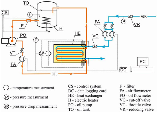 In tests carried out in the steady state, as in the transient state, a constant flow of oil and its temperature were maintained at the heat exchanger inlet. A constant flow of air was also supplied to the exchanger long enough for the system to reach equilibrium (i.e., when the air and oil temperatures at the exchanger outlet and the average block temperature were constant). Once the equilibrium state was reached and the test results were recorded, the value of the air flow was changed. Such conditions correspond to the cooperation of the exchanger with a hydraulic motor operating in a continuous manner. In addition, in the steady state, the quantities characterizing heat transfer in the exchanger can be determined more reliably (than in the transient state).