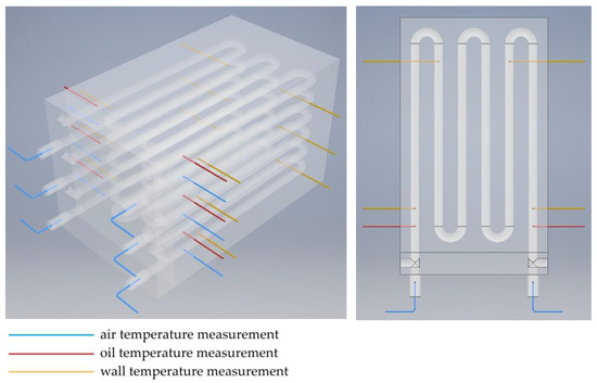 The oil temperature and the exchanger wall temperature were measured using K-type thermocouples with a diameter of 1 mm. Thermocouples with a diameter of 0.25 mm with a connector fused to the shell were used to measure air temperature. The low thermal inertia of these thermocouples allowed transient state testing. The measuring probes of the thermocouples measuring fluid temperatures were located in the axis of the individual channels, at the inlet and outlet of the heat exchanger. The temperature of the exchanger block was measured at 12 points lying on 3 planes located between the air and oil channels of each exchanger module. The location of all 24 temperature measurement points is shown in Figure 6. Thermocouples were connected by eight-channel measuring modules equipped with a reference temperature stabilization and correction system. Prior to testing, the temperature measurement system was calibrated. All thermocouples were checked at two fixed thermometric points (i.e., at the melting point of ice and the boiling point of distilled water). After calibration, the readings of all thermocouples were within ±0.2 K with respect to the reference temperature.