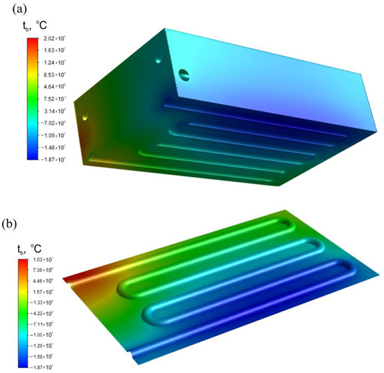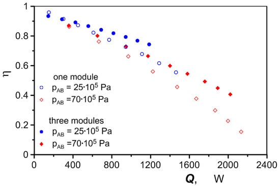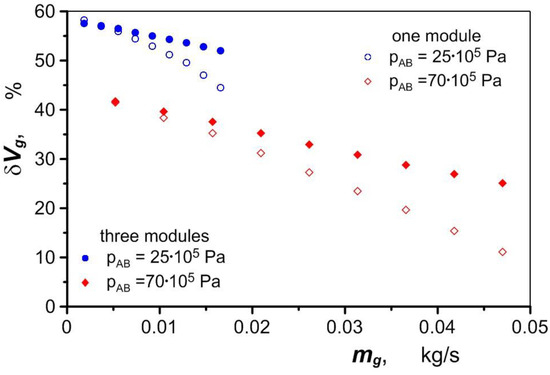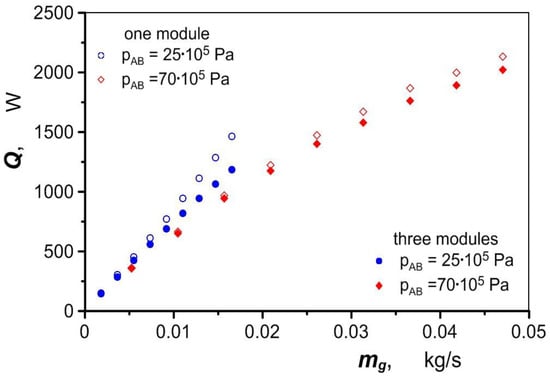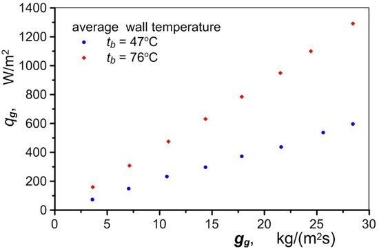 Figure 8 shows the heat flux density qg taken up by the air in the exchanger for two different average temperatures of the exchanger block . The relatively small value of the heat flux determined by Equation (2) is due to the heat that is transferred to a large heat transfer surface area. This surface area consists of the contact area of the air with the channel wall Ach and the area of the foam skeleton Asf,