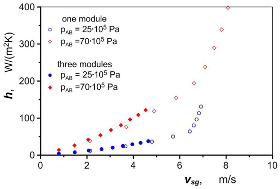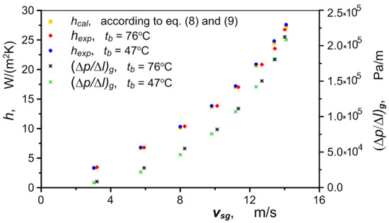 As can be seen in Figure 8, the heat flux taken up by the air clearly depends on the wall temperature , as well as the air flux. The wall temperature has no effect on the intensity of the heat transfer. Figure 9 shows a clear, almost exponential effect of the air velocity on the value of the heat transfer coefficient hexp (regardless of the temperature ). The nature of the variation in this coefficient is due to the direct correlation between air velocity and pressure. The pressure drop ∆p/∆l through metal foams is relatively high. The pressure in the exchanger rises sharply as the air flow increases, compressing the air and causing a disproportionately small increase in velocity compared to the increase in the flow. The analogous nature of changes in the pressure drop and heat transfer coefficient was recorded during the tests (Figure 9).