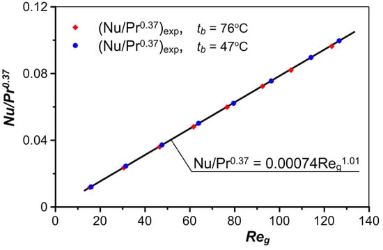 The values of the heat transfer coefficient hcal determined based on Equations (8) and (9) differ by no more than 2% from the values of hexp, obtained experimentally. A comparison of these values is presented in Figure 9. The values of the Nusselt number Nu calculated using Equation (8) and the corresponding values calculated based on hexp are shown in Figure 10.