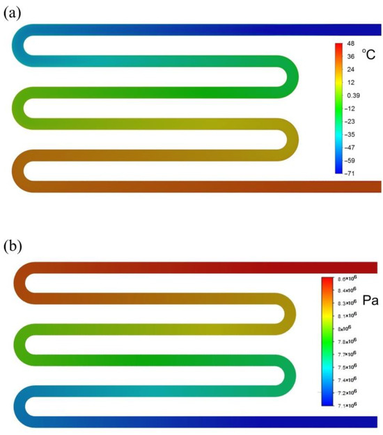 In the case of the heat exchanger designed as part of the work described in this article, this pressure drop is less important. Ultimately, the heat exchanger will be integrated into the air expansion system by throttling. The driving force for the air flow will be the pressure difference between the MGT and the hydraulic motor converters. Pushing air through the heat exchanger will therefore not require additional energy, e.g., for the compressor drive.