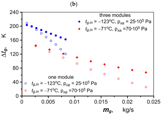 During the tests, a rapid increase in the final temperature of the air tg,out entering the exchanger was observed. The air reached its maximum temperature in less than 3 s in all cases tested (for different air flows), as shown in Figure 7. The temperature of the air flowing out of the exchanger was approximately 2 K lower than the temperature of the oil supplied to the exchanger, which indicates its high efficiency.
