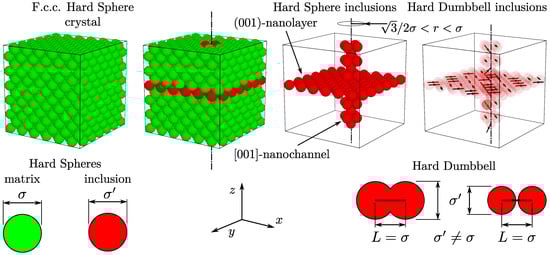 The model studied in this work is an extension of the model studied in [61]. It consists of N hard spheres with a diameter , initially forming the f.c.c. lattice at close packing. The value is also treated as the unit of length. For such a system, inclusions are introduced by replacing some of the particles with other hard spheres of a different diameter (). The choice of the shape and size of the inclusions is arbitrary; here, only the combination of a single nanochannel and nanolayer is considered. The nanochannel is oriented in the -direction and has a radius equal to . All spheres forming the original system (which will be further referenced as the matrix crystal), whose centres of mass are positioned at close packing within this distance from a selected crystalline axis, are replaced with the -spheres. The nanochannel radius has been selected, such that only the particles lying directly on the crystalline axis and their nearest neighbours are included. The nanolayer is oriented orthogonally to the nanochannel, and, similarly, all spheres that form a selected crystallographic plane are replaced with inclusion spheres. This is illustrated in Figure 1. Such a case, where the inclusion is formed by hard spheres, has been studied in [61]. Here, an additional condition (constraint) is introduced into the model by randomly paring the neighbouring inclusion spheres into diatomic molecules—hard dumbbells. Thus, the degenerate crystal phase is obtained within the inclusion. The elastic properties of a 3D degenerate crystalline system with nanochannel inclusions filled with hard spheres has been studied in [72].