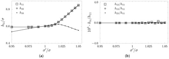 The diagonal elements of the box matrix (a) and the ratio of the off-diagonal box matrix elements and (b) for systems with dumbbell inclusions at , plotted against .