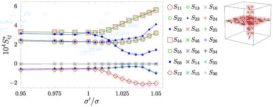 The inclusion introduced to the f.c.c. crystal, whether composed of spheres or with the disordered phase of diatomic dumbbells, results in a shape change in the sample. In Figure 2, one can observe how the unit supercell changes from cubic () to cuboid with a square base. The x and y dimensions increase to compensate for the increasing atomic diameters in the nanolayer, and the z direction shrinks as the remaining particles have more space to compress under pressure. Figure 2b shows the off-diagonal components of the box matrix in relation to , and it can be seen that they are at least three orders of magnitude less than the diagonal ones. This shows that the supercell has the cuboid shape. Following the change in shape, the symmetry of the system also changes due to the presence of inclusion. In Figure 3, the components of the elastic compliance matrix () have been presented and compared with the values of the f.c.c. cubic crystal (). One can see that lowering the value (decreasing atomic diameters of molecules) does not impact elastic properties significantly. However, when , the change in crystalline symmetry is clear. It can be noted that the following relations , , and are fulfilled, and that the symmetry of the crystal with such inclusion is tetragonal (422 symmetry class [80]). Thus, the elastic compliance matrix takes the following form:
