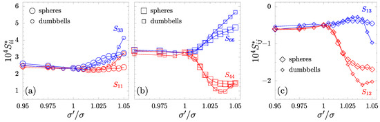 The same symmetry has been observed in the case of the same combination of inclusions filled only by spheres [61]. An important remark should be made here, that as a common reference point to both systems with inclusions, the pure f.c.c. crystal of hard spheres with the diameters has been selected. One should be aware that the presence of molecular bonds from dumbbell particles at (in that case they are called dimers) will also have a certain (small) impact on the elastic properties. This difference is very small compared with the effects discussed in this work (one can analyse the changes in Figure 3 between and ), and thus is ignored. In Figure 4, the comparison of the non-zero matrix elements between atomic and molecular inclusions have been presented. It can be seen that additional constraints in the form of disordered molecular bonds exert more significant changes in the elastic properties than in the case of atomic systems (especially for (b) and (c)).