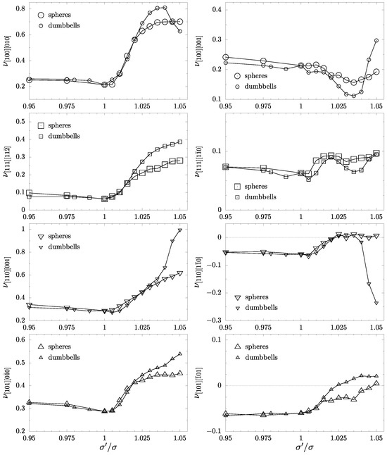 The presence of inclusions and the changes in the crystal symmetry are clearly visible in the behavior of the Poisson’s ratio of both systems. In Figure 5 PR in typical crystallographic directions has been presented. The notation of the directions in the form , where n indicates the direction where the load is applied and m is the direction in which the Poisson’s ratio is measured. It can be also noted that in the case of cubic symmetry, respective pairs of directions are equivalent. Namely, and are elastically isotropic, so the value of PR in these directions does not depend on m. Furthermore, the PR is invariant on the choice of n as or in the cubic case. It can be seen in Figure 5 that, in the case of inclusions containing a disordered crystalline phase of hard dumbbells, the PR typically increases more at the given . The auxetic properties (an inherent property of an f.c.c. crystal) are removed in both, the and directions at . Yet, they are still present in the case of spherical inclusions in the latter direction, and they disappear only at . Overall, in the dimer system at , the Poisson’s ratio in some other directions can be found to be negative, but its value is negligibly small. An interesting difference between the spherical and the disordered molecular inclusions is that the latter significantly decreases Poisson’s ratio in the direction when (see also Figure 6). PR reaches and shows a significant decrease over for the cubic case.