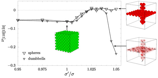 Comparison of the Poisson’s ratio in the selected, typical crystallographic directions for systems with inclusions composed of hard spheres [61] (large symbols) and the ones composed of hard dumbbells (small symbols).