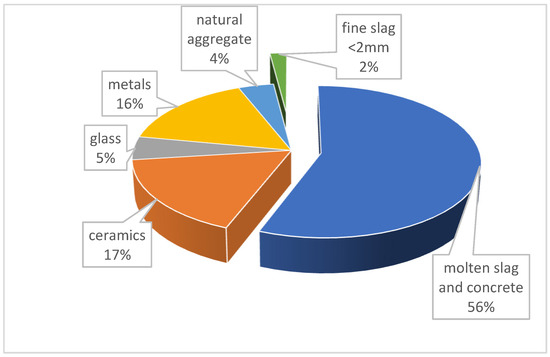 The composition of slag can vary significantly depending on the origin and type of waste disposed of or incinerated. An analysis of slag composition showed significant differences compared to data in the literature, such as those presented in [29]. The glass content is at a similar level as reported by the literature sources, but the content of construction waste, especially ceramics and concrete rubble, is significantly higher. The slag is characterized by a water absorption of 17.9% and a loose bulk density of 1230 kg/m3.