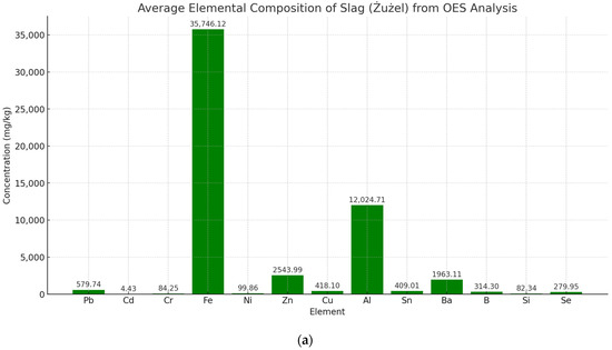 The OES analysis of the slag samples, as shown in Figure 3a, reveals significant concentrations of key elements such as iron (Fe) (35,746.12 mg/kg), aluminum (Al) (12,024.71 mg/kg), and zinc (Zn) (2543.99 mg/kg), with lead (Pb) and chromium (Cr) also present at notable levels. Iron dominates the composition, which is consistent with the slag’s origin from the municipal waste incineration process, where metals accumulate during combustion. The elevated aluminum content raises concerns regarding its reactivity when used in cement composites. In particular, aluminum reacts with water to form hydroxides and release hydrogen gas, which can lead to swelling and cracking of the concrete, posing a serious risk to the material’s structural integrity. Additionally, the presence of heavy metals such as lead (Pb) (579.74 mg/kg) and zinc (Zn) poses potential environmental risks, especially in terms of leaching into soil and groundwater if the slag is not sufficiently treated prior to use.