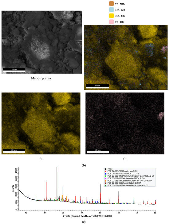 The EDS (Energy Dispersive Spectroscopy) analysis provides a more localized view of the elemental composition of the slag, offering insights into the distribution of specific elements. The analyses were performed in accordance with EN ISO 22309:2011 [32]. The EDS mapping, shown in Figure 3b highlights the presence of silicon (Si), aluminum (Al), sodium (Na), and chlorine (Cl) across the slag sample. Silicon, consistent with the silicate nature of the slag, is the most abundant element. The significant presence of aluminum confirms the findings from the OES analysis and further emphasizes the potential chemical reactivity of the slag. However, it is important to note that EDS provides only a qualitative analysis of a small area and is not fully representative of the entire sample.