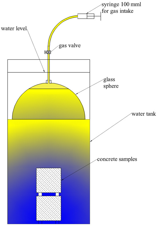 To measure gas emissions, a test rig and a measurement method were developed. Concrete cubes of known volume (150 mm × 150 mm × 150 mm), 2 in each tank, were submerged in water and covered with glass domes also submerged in water (Figure 5). Concrete cubes were placed in the tank, which came from the formula C (concrete on aggregate composed of slag from waste incineration). The gas emitted from the samples accumulated under the glass dome, and an air/gas cushion was formed. After a certain period of time, depending on the intensity of the gas emission, the accumulated gas was then evacuated with a syringe until the air cushion was completely removed. This made it possible to easily and accurately estimate the volume of gas emitted by the samples.