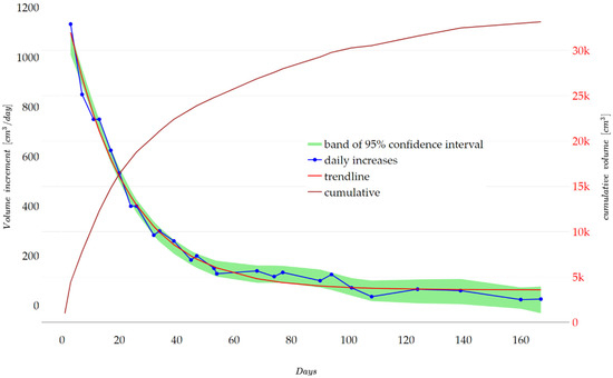 Figure 6 shows the cumulative volume of gases emitted by the concrete cubes (2 pieces) in tank one. The figure also shows the changes in the daily increase in the volume of gas released, along with the bands of the 95% confidence interval and the trend line (r2 = 0.988).