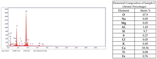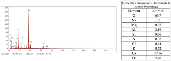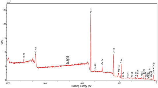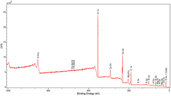 Analyzing the elemental composition, it can be concluded that the sample mainly consists of oxygen, calcium, aluminum, iron, silicon, magnesium, sodium and sulfur (Figure 10). Elemental content in the composition of less than 0.5% can be considered insignificant, or their appearance may be due to a measurement error of the instrument.